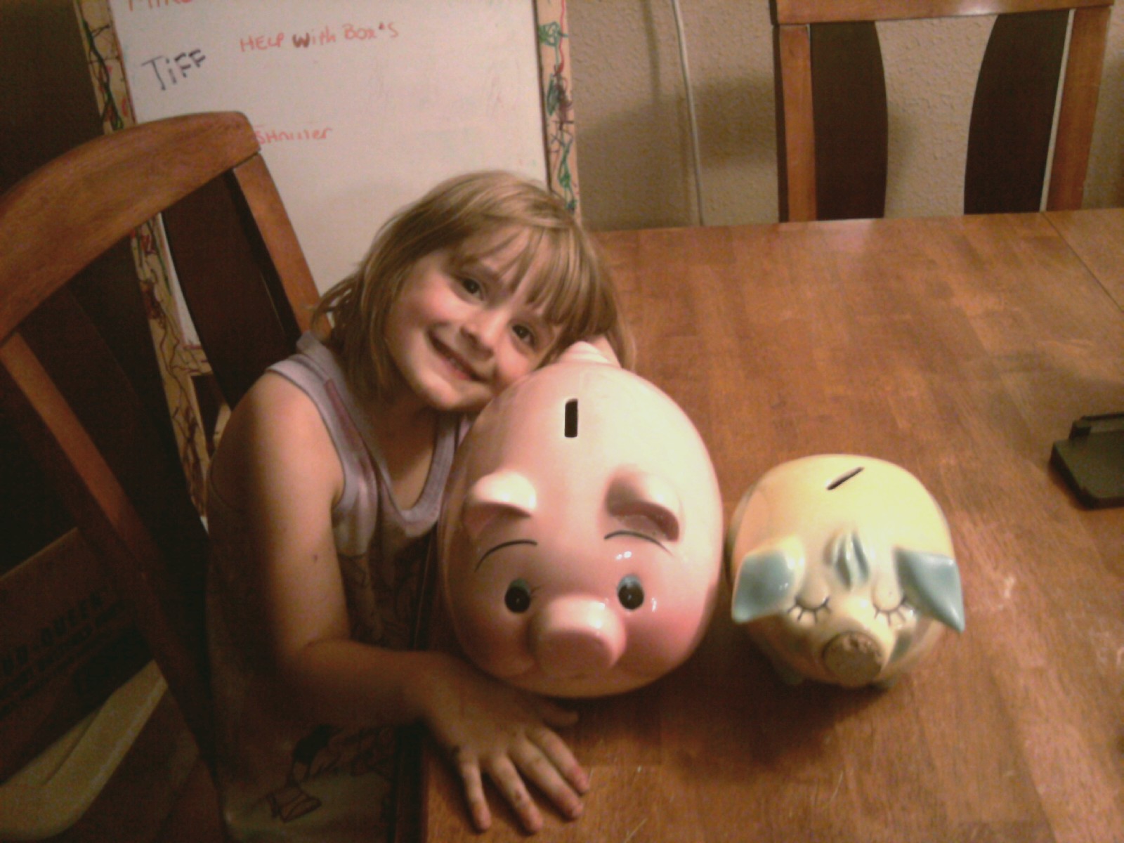 I’m going to leave you with one final picture (and memory). For as long as I can remember, the only item of my mom’s that I really cared about, that I knew I wanted to remember her by, was her piggy bank. It’s yellow with blue ears and has a cork for a nose. When I was little, she would pull the cork and dump all her change out on the floor. It’s how she taught me to count change and I spent hours doing it. Now I use that piggy bank, and I gave mine to my youngest daughter, Lily. She and I empty our banks out on the floor and count them together. At five, she has a very good understanding of money, even the small pieces. When she finds a penny on the ground, she always picks it up and says, “Look, Mom! It’s my lucky day!”